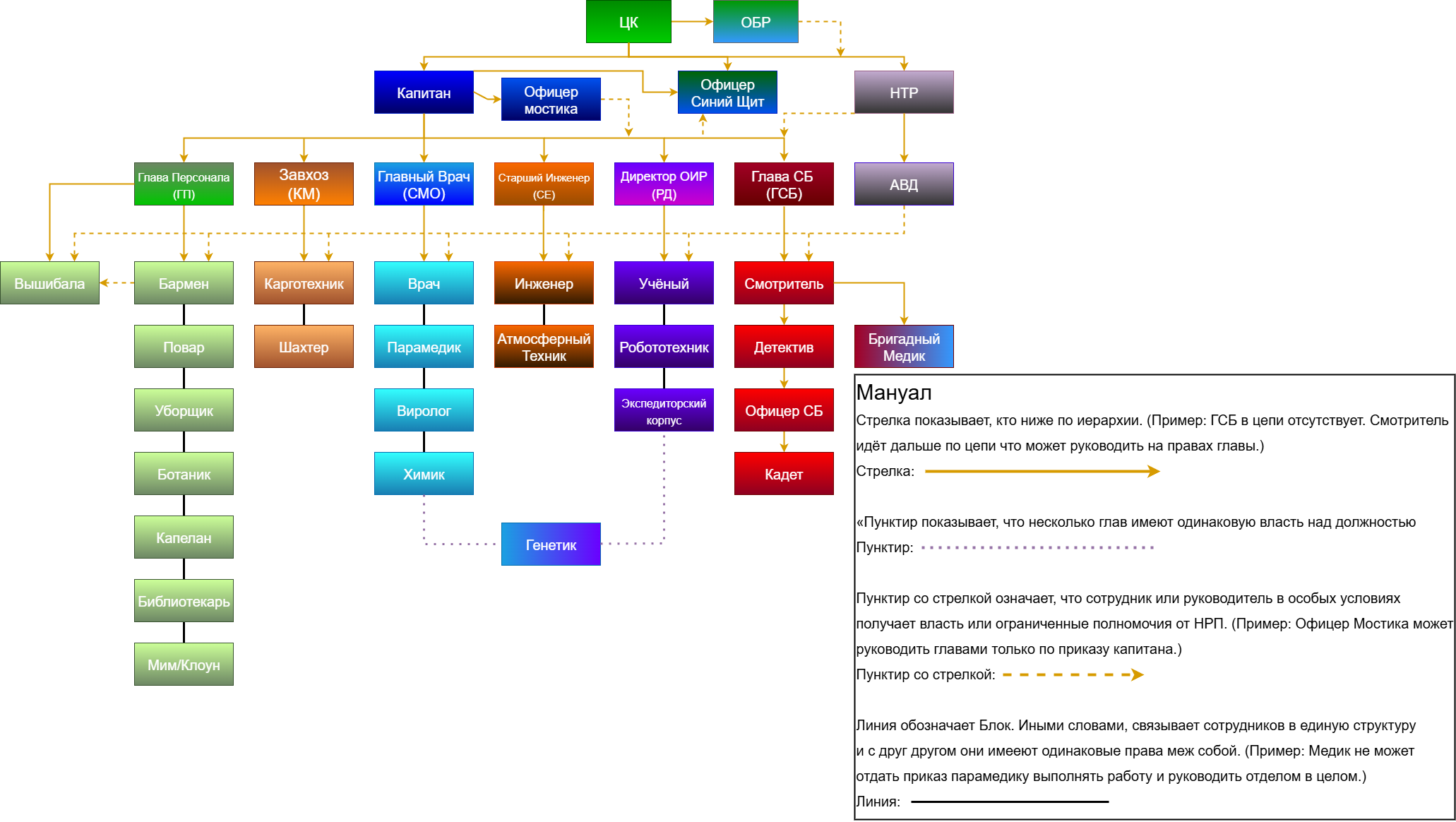 - Персонал станции обязан беспрекословно следовать приказам Службы Безопасности, Главам своих Отделов, Капитану и отряду быстрого реагирования, любое неповиновение карается смертью.